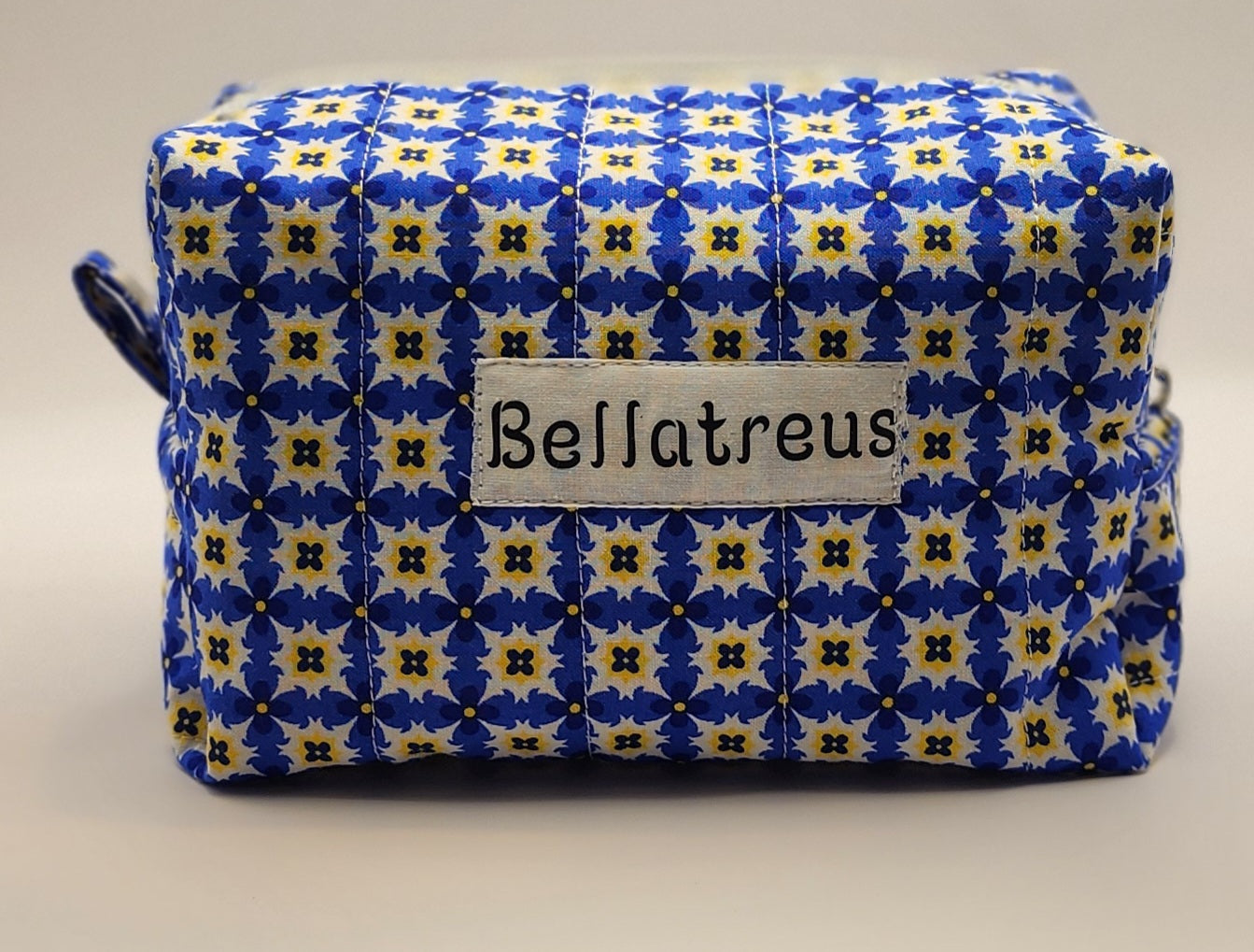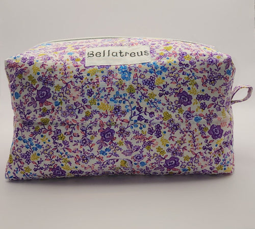 This handmade cotton toiletry bag features quilted, coordinated linings and a secure zipper closure with a convenient tab and handle. Available in three sizes—Mini (8x5x5), Medium (9x7x6), and Large (12x8x7)—each bag offers unique charm with slight variations due to its handcrafted nature. Perfect as a stylish core accessory or thoughtful gift, it pairs beautifully with matching pouches and key chains for a complete, coordinated set.